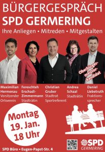 Gemeinsam mit der SPD-Stadtratsfraktion und dem Vorstand der SPD Germering nehme ich mir Zeit für Ihre Fragen, Ideen und Anliegen. Das Bürgergespräch ist als offene Sprechstunde gedacht – ohne große Hürden, auf Augenhöhe und im direkten Austausch.