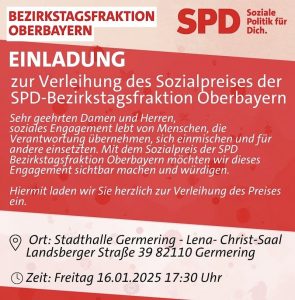 Am Freitag, den 16. Januar 2025, wird um 17:30 Uhr im Lena-Christ-Saal der Stadthalle Germering der Sozialpreis der SPD-Bezirkstagsfraktion Oberbayern verliehen. Mit diesem Preis werden Persönlichkeiten ausgezeichnet, die sich über viele Jahre hinweg in besonderer Weise für soziale Belange engagiert haben – oft still im Hintergrund, aber mit großer Wirkung für unsere Stadtgesellschaft.