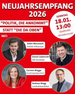 Am Sonntag, den 18. Januar 2026, um 13:00 Uhr lade ich gemeinsam mit der SPD Germering herzlich zum Neujahrsempfang in die Stadthalle Germering (Amadeussaal) ein. Zum Start ins neue Jahr möchte ich mit Ihnen ins Gespräch kommen – offen, ehrlich und auf Augenhöhe.